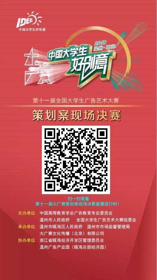 本届大广赛策划案现场决赛由中国高等教育学会广告教育专业委员会、温州市人民政府、全国大学生广告艺术大赛组委会主办,温州市瓯海区人民政府、温州市市场监督管理局、大广赛文化传播(北京)有限公司承办,浙江省瓯海经济开发区管理委员会,温州广告产业园(瓯海总部经济园)协办。大广赛是迄今为止全国规模大、覆盖面广、参赛院校多、参加师生人数多、参赛水平高的全国性大学生赛事。自2011年第四届大广赛至今,已成功举办了7次策划案现场决赛。参赛学生通过现场提案的方式,在规定的时间内,向评委们展示品牌推广策略方案。这是一场高水平的创意巅峰对决,更是大广赛独有的表现形式和亮点。