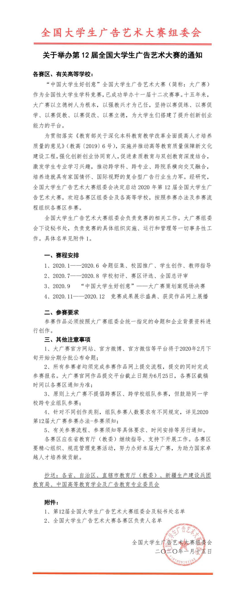 为贯彻落实《教育部关于深化本科教育教学改革全面提高人才培养质量的意见》(教高〔2019〕6 号), 实施并推动高等教育质量保障新文化建设工程,强化创新创业协同育人,促进素质教育与双创教育深度结合,激发学生专业学习兴趣,推动跨学科、跨专业、跨院系横向交叉融合,培养造就具有家国情怀、国际视野的复合型广告行业生力军。经研究,全国大学生广告艺术大赛组委会决定启动 2020 年第 12 届全国大学生广告艺术大赛,欢迎各赛区组委会及各高等学校,按照参赛办法及参赛流程组织各赛区参赛。 现将有关事宜通知如下: