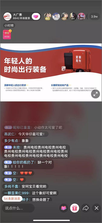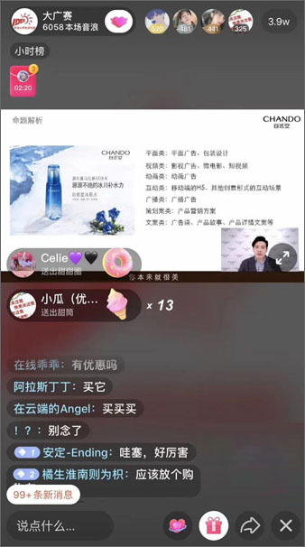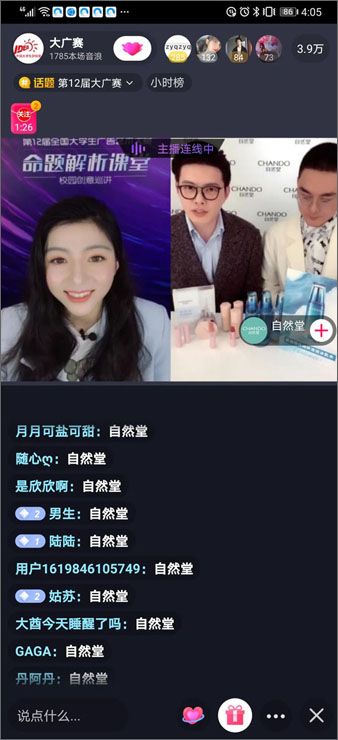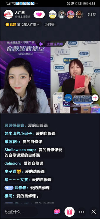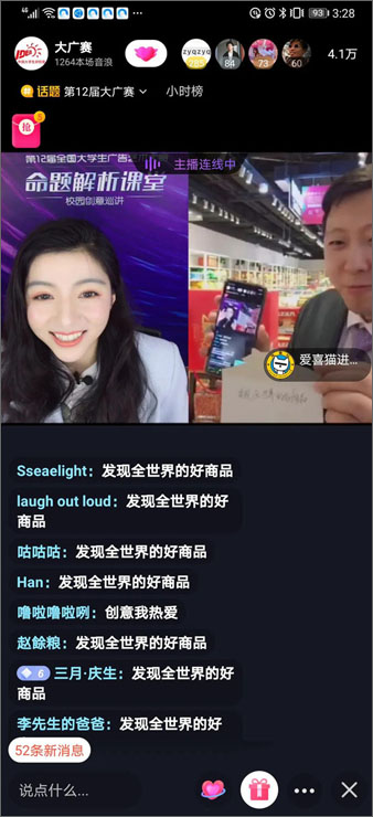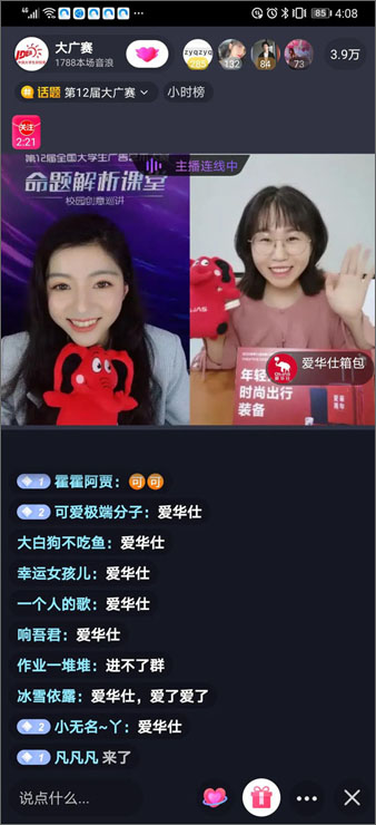 本场直播在北京、上海、浙江、广州四个分会场进行,自然堂、义乌、爱华仕、杜蕾斯四家命题企业嘉宾亲临直播现场,解析命题和线上答疑,并为大家带来了丰厚的“见面礼”。整场直播精彩纷呈,高潮迭起,万人在线打Call,弹幕如潮,如火如荼,互动频繁,有很多同学已经期待下一场大广赛的直播分享了。