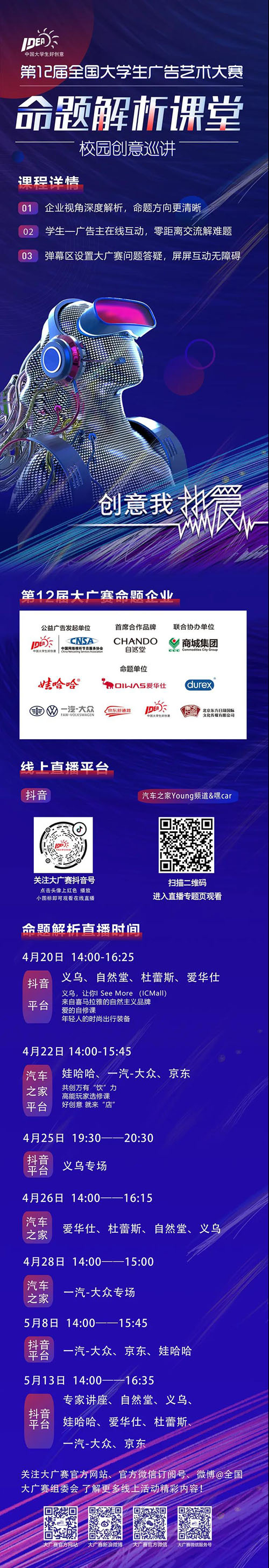 生活不止诗和远方~还有大广赛直播课堂!有才华~具内涵~懂品味的小伙伴们,这可是你们万万不能错过的精彩哦!4月22日周三14:00,大广赛将在汽车之家平台开启第二场命题解析直播课,届时娃哈哈、一汽-大众、京东三个命题的企业嘉宾将带来更为精彩的解析互动环节,更多惊喜礼物也在等着大家,本周三14:00我们不见不散!