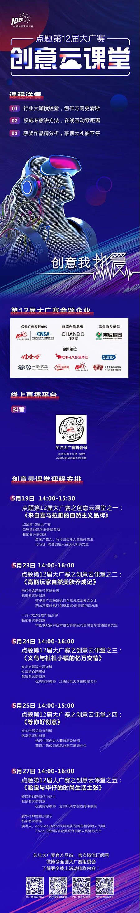 第一期大广赛命题解析课堂到这里就结束啦,后续将会在官方微博上传命题解析课堂回放,错过直播的小伙伴可以前往微博观看回放哦。接下来大广赛组委会将正式开启第二期直播——《点题第12届大广赛之创意云课堂》,以行业专家的创意拔高为主导,课程的内容包括:企业讲师互动答疑、作品创意指导以及不同类别的创作技巧。旨在更有针对性的剖析命题创作重点,帮助学生打开思路,找到创意切入点,丰富题材及表现。