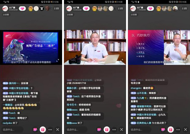 大广赛组委会邀请优秀指导教师江西师范大学戴微星老师参与充满智慧的创意云课堂,通过直播讲述《影视广告创意“三板斧”》,整场课堂直播深入浅出,高潮迭起。赢得了同学们的在线表白!戴老师从科学组织、优选体例、巧妙执行三个角度为大家展开剖析,加强参赛的同学们对视频广告创作的理解,带领大家通过实践经验来运用创意技巧。课程文字提炼浅显易懂,创意口诀朗朗上口记忆深刻。最后戴老师详细的为大家解读了义乌与杜蕾斯命题,同学们留言表示受益匪浅。