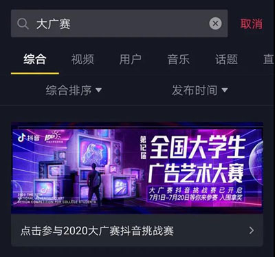 ②打开抖音直接搜索“大广赛”,进入2020大广赛抖音挑战赛h5页面进行报名。
