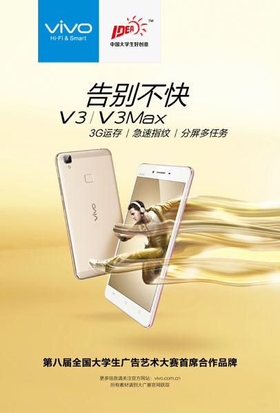 由教育部高等教育司指导,教育部高等学校新闻传播学类专业教学指导委员会、中国高等教育学会广告教育专业委员会共同主办,中国传媒大学、全国大学生广告艺术大赛组委会承办的2016第八届全国大学生广告艺术大赛将于2016年4月11日在北京服装学院拉开帷幕。vivo作为手机市场翘楚,携手“大广赛”成为首席合作品牌,并提出了“告别不快”的创意命题,向全国的年轻学子发出了创意征集令。
