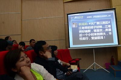最后,著名广告人江绍雄先生以其特有的幽默方式出场,结合近期热播节目《中国好声音》的种种现象,风趣地解析了美妙的创意是如何撩人心扉。回答师生提问阶段,江先生妙语连珠,报告厅里充满欢声笑语,现场微博互动达到高潮,多名学生写到“长途奔袭赶来,果然不虚此行!”