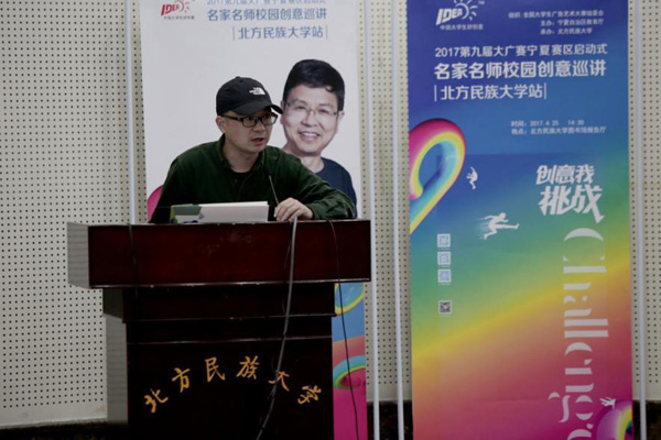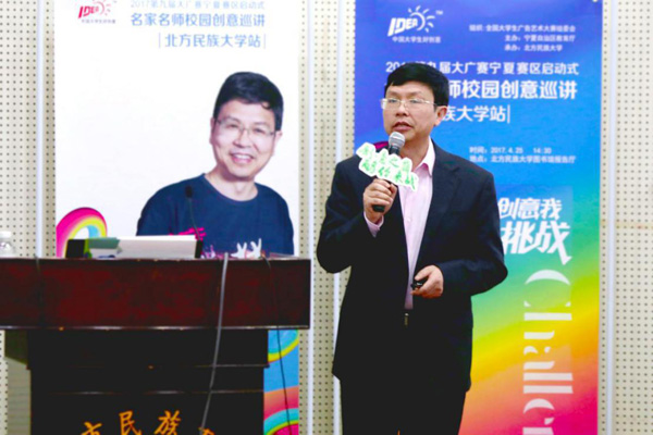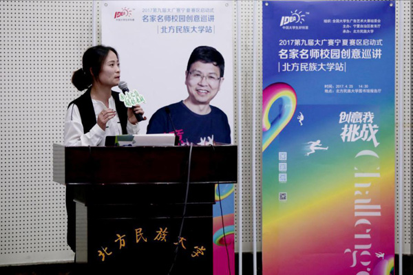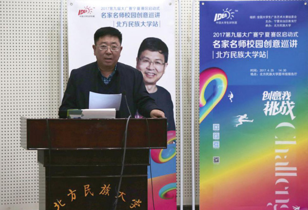 4月25日下午,第九届全国大学生广告艺术大赛宁夏赛区名家名师校园创意巡讲在北方民族大学隆重举行。本次活动由宁夏回族自治区教育厅、宁夏赛区组委会主办,北方民族大学承办,全国大学生广告艺术大赛组委会组织。 |