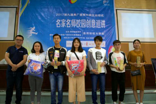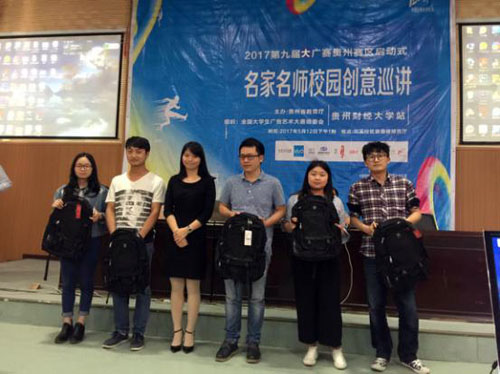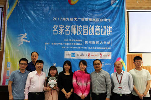 2017年5月12日下午,第九届大广赛贵州赛区启动仪式暨名家名师校园创意巡讲在贵州财经大学崇德楼一楼报告厅举行。本次活动由贵州省教育厅、贵州赛区组委会主办,贵州财经大学承办,全国大学生广告艺术大赛组委会组织。 出席此次巡讲活动的有:贵州财经大学党委副书记肖建宗教授,贵州财经大学学生处处长周晶老师,大广赛贵州赛区负责人、贵州财经大学文化传播学院MAC中心主任罗健副教授,湖南大学新闻传播与影视艺术学院、教学副院长李正良教授,vivo手机终端部部长胡洪锋先生,世界文化遗产平遥古城保护管理委员会营销中心主任王正宇先生,爱华仕市场部主任王敏红女士。以及来自贵州大学、贵州师范大学、贵州财经大学、贵州民族大学、凯里学院、求实学院、贵州交通职业技术学院、贵州工业职业技术学院、城市学院等院校近300余师生齐聚一堂,参加了此次活动。 活动开始,贵州财经大学学生处周晶处长致辞,热烈欢迎同学们参加此次活动,祝同学们创造佳绩,预祝本届大广赛取得圆满成功。随后,大广赛贵州赛区负责人,贵州财经大学文化传播学院MAC中心主任罗健副教授讲述了大广赛参赛注意事项,提醒同学们避免不必要的错误。 命题企业vivo、平遥古城、爱华仕代表对命题进行了深入的解析。 同学们通过解析更加深刻地了解企业品牌文化,找到了广告创意新思路。企业文化与校园文化的碰撞交融,直观的产品感受和独特的企业内涵,给同学带来新鲜的能量。企业通过多种活动形式拉近与同学间距离,同学们积极踊跃参与,气氛达到高潮。 本次活动特邀请湖南大学新闻传播与影视艺术学院,教学副院长李正良教授,带给大家主题为《洞察与坚守:好创意来自哪?》的精彩讲座。李教授通过解析经典广告案例,为同学们讲解该如何进行创新,拒绝传统古板思维,不要拘束于日常的思维,要勇于创新,结合日常,勇于突破常规。 最后,主持人对本次大会进行总结,感谢到场的各位嘉宾和老师同学,感谢各位命题企业嘉宾对于大广赛命题的深入解析,感谢李教授对广告创意的解读。历时四个小时的活动在同学们热烈的掌声中圆满结束,本次巡讲活动,调动了同学们参加大广赛的积极性,同时对即将展开的创作充满激情,让我们期待本届大广赛涌现更多优秀的创意作品。