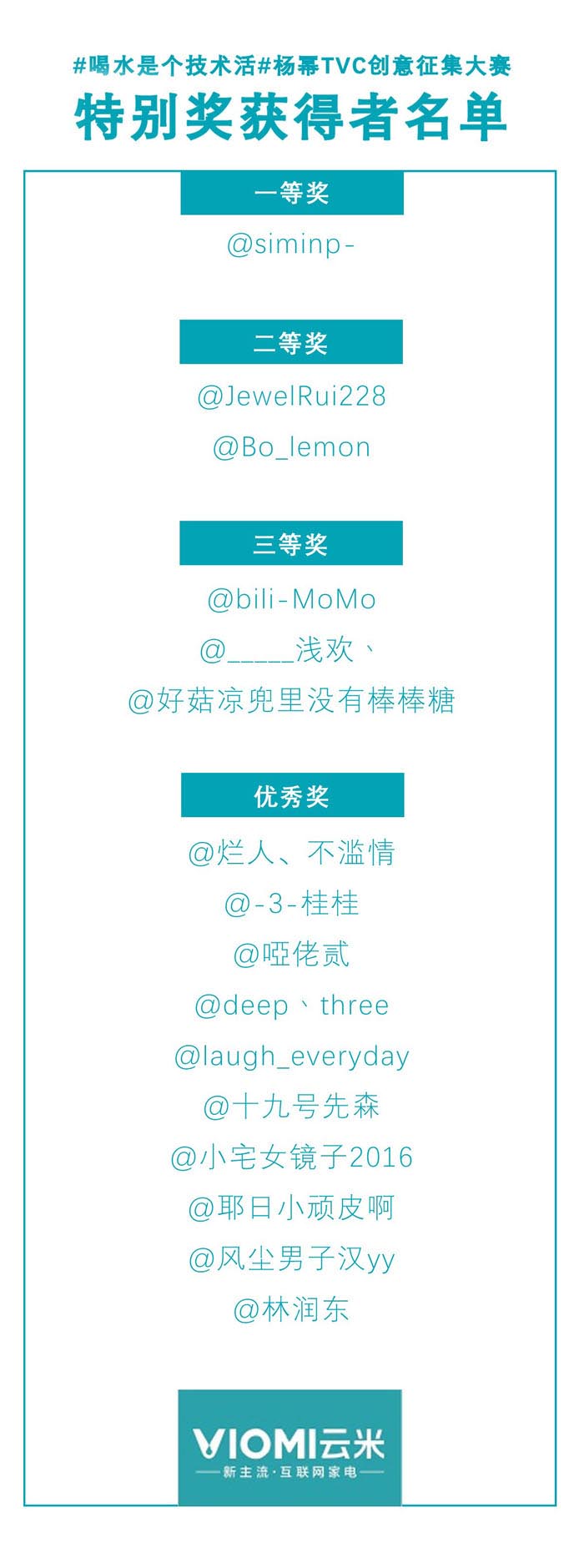 #喝水是个技术活# 云米净水器创意征集特别奖获奖名单揭晓。云米公司和大广赛组委会为了让好创意不被埋没,鼓励同学们的辛苦创作,特邀请大广赛的专家评委从大学生群体的合格参赛作品中,评选出本次创意征集特别奖。经过认真评选,现将结果公布如下:
