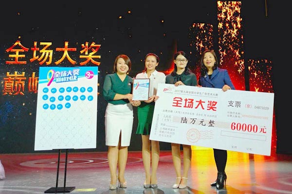 担任第九届大广赛全场大奖评委的是来自全国各赛区的42位资深评委、赛区负责人及优秀指导教师。此次共有三件作品突出重围进入全场大奖角逐,动画类、平面类、策划案类作品各一件,经过候选团队的现场作品展示、陈述、答辩、拉票等环节,最后由全场投票选出。最终来自于上海师范大学的《“一带一路”上的甜蜜》团队摘得桂冠,并获得了六万元全场现金大奖。