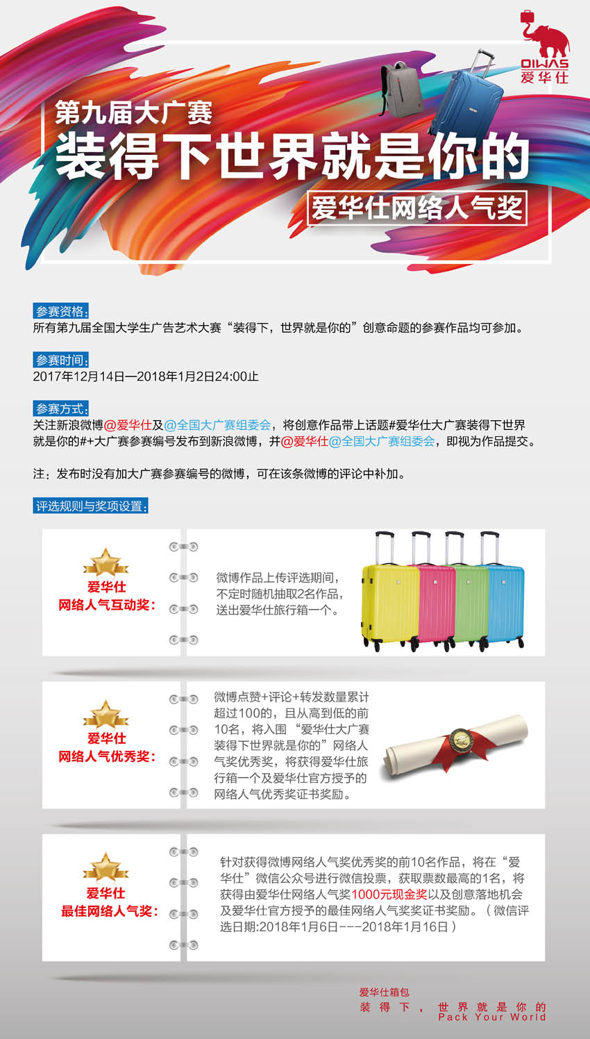 第九届全国大学生广告艺术大赛爱华仕命题“装得下,世界就是你的”的所有参赛作品均可参加。