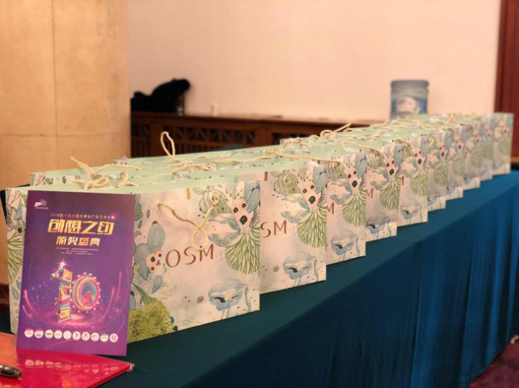 欧诗漫作为第十届大广赛的礼品赞助商,从网络人气奖评选开始便为参与者准备了精美礼品;在全国总赛区颁奖典礼上,欧诗漫为颁奖嘉宾提供了时光珍萃礼盒,为优秀指导教师与优秀组织工作者提供了欧诗漫珍珠白·净透润白礼盒,更为现场观众准备了超多伴手礼。