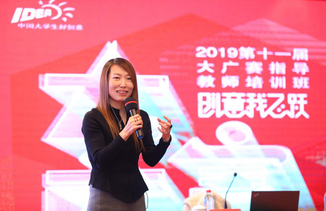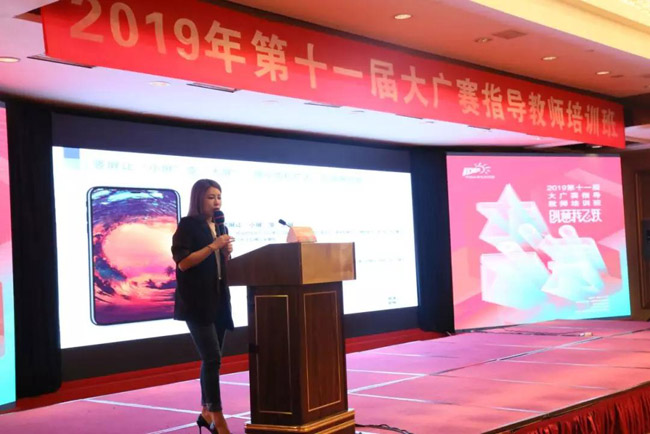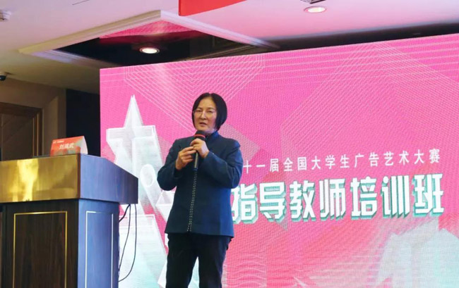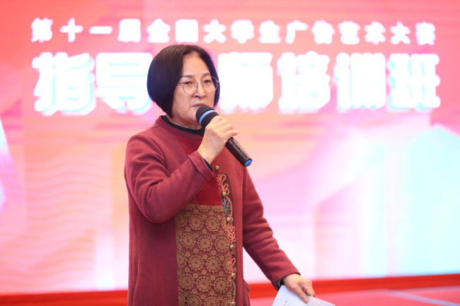 在开班典礼上,大广赛组委会刘瑞武秘书长在会上致辞,向来参加培训的指导教师表示热烈的欢迎。她说,3月19日习总书记在学校思想政治理论课教师座谈会上指出:办好思想政治理论关键在教师,关键在发挥教师积极性、主动性、创造性,这也适用于我们广告艺术设计学科老师。刘秘书长还说教师是“立教之本,兴教之源”,老师要给学生心灵埋下真善美的种子,引导学生扣好人生第一粒扣子。她又说指导教师培训班的意义就是要遵循教书育人的规律、遵循学生成长的规律,老师通过不断学习提高,在教学中增强针对性、时代性和吸引力。满足学生的成长发展需求和期待。之后刘秘书长介绍了指导教师培训班的内容,希望此次培训能让大家深入了解当前行业及市场需求,提升教师的教学指导经验。