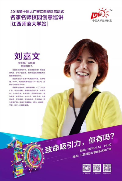 JJ被江湖人士奉为日月潭不老创意教母,一则是因为她行走江湖多年,见多识广,其功法与电通、WPP、博报堂集团等数大门派皆有渊源;二则因为她为人豪迈并善于分享,毫不吝啬将自己多年来潜心苦练的创意内功心法传授众人,江湖各创意流派受其点拨者众,尤其是赣鄱江西,其两度云游至此,受益者众。 |
