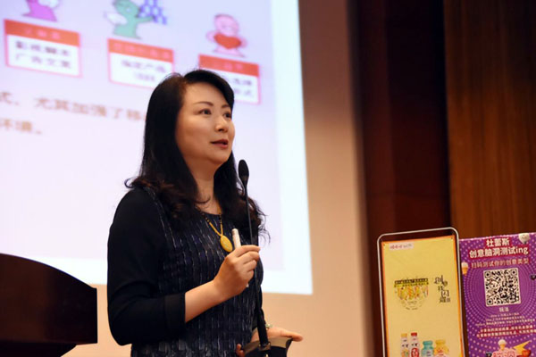 第三位上台的是娃哈哈集团湖北销售分公司拓展副总监杨君君女士。杨女士从抖音上流传甚久的“娃哈哈”段子说起,和同学们开展了丰富的互动,随着一箱箱大红枣饮品的送出,现场欢笑声连连。杨女士以娃哈哈大红枣枸杞&芒果酸奶饮品为例,针对平面设计等广告领域给出了自己独到而鞭辟入里的见解,让同学们感到受益匪浅。