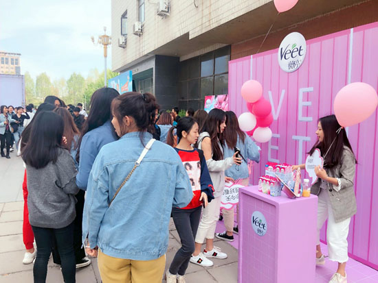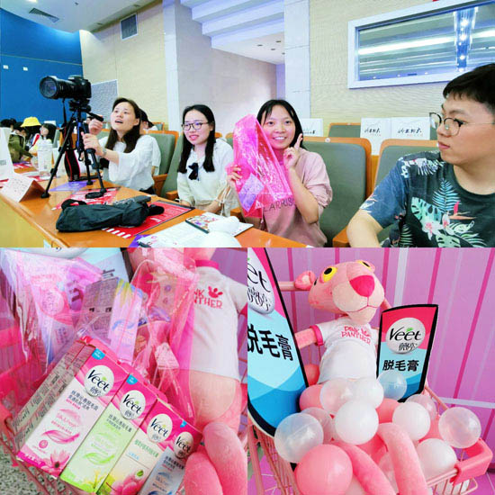 在巡讲活动展示区,大家一下子就被薇婷粉色点位吸引。倪妮代言人海报,粉红气球,粉红豹……满满的都是少女心!同学们聚集在点位前领取脱毛膏体验装,打卡拍照,好不热闹!