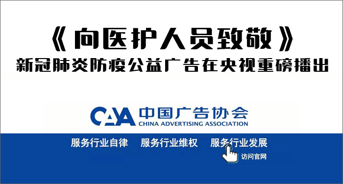 《向医护人员致敬》新冠肺炎防疫公益广告在央视重磅播出!由中央广电总台、国家卫健委健康推广信息平台和中国广告协会联合制作的抗击疫情公益广告在中央电视台多个频道全天候播出,敬请关注!